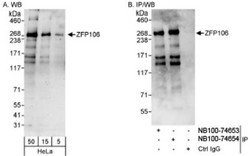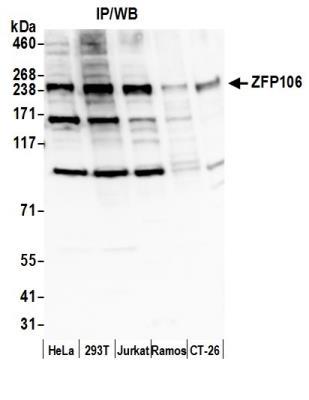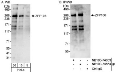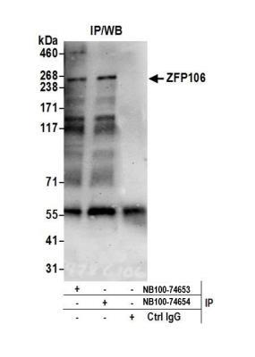 - Immunoprecipitation: ZFP106 Antibody [NB100-74653] - Detection of human ZFP106 by western blot of immunoprecipitates. Samples: Nuclear Extract (0.5 or 1.0 mg per IP reaction; 20% of IP loaded) from HEK293T cells. Antibodies: Affinity purified rabbit anti-ZFP106 antibody NB100-74653 used for IP at 6 ug per reaction. ZFP106 was also immunoprecipitated by rabbit anti-ZFP106 antibody NB100-74654. For blotting immunoprecipitated ZFP106, NB100-74653 was used at 1 ug/ml. Detection: Chemiluminescence with an exposure time of 75 seconds.