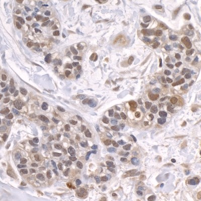 - Immunohistochemistry-Paraffin: ZFP106 Antibody [NB100-74654] - Section of human breast carcinoma. Antibody: Affinity purified rabbit anti- ZFP106 used at a dilution of 1:1,000 (1ug/ml). Detection: DAB
