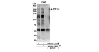 - Immunoprecipitation: ZFP106 Antibody [NB100-74654] - Nuclear Extract (0.5 or 1.0 mg per IP reaction; 20% of IP loaded) from HEK293T cells. Antibodies: Affinity purified rabbit anti-ZFP106 antibody NB100-74654 (lot 2) used for IP at 6 ug per reaction. ZFP106 was also immunoprecipitated by rabbit anti-ZFP106 antibody NB100-74653. For blotting immunoprecipitated ZFP106, NB100-74654 was used at 1 ug/ml. Detection: Chemiluminescence with an exposure time of 75 seconds.
