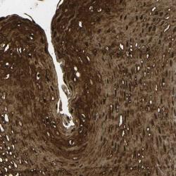 - Immunohistochemical staining of human esophagus shows strong cytoplasmic and nuclear positivity in squamous epithelial cells.