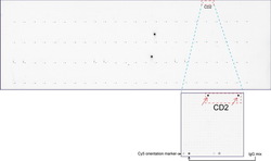 - OriGene overexpression protein microarray chip was immunostained with UltraMAB anti-CD2 mouse monoclonal antibody (UM800017). The positive reactive proteins are highlighted with two red arrows in the enlarged subarray. All the positive controls spotted in this subarray are also labeled for clarification.