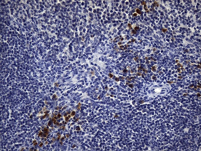 - Immunohistochemical staining of paraffin-embedded mouse spleen tissue using anti-CD2 clone UMAB6 mouse monoclonal antibody. (Heat-induced epitope retrieval by 1mM EDTA in 10mM Tris buffer (pH8.5) at 120°C for 3 min, UM500006)(1:500).