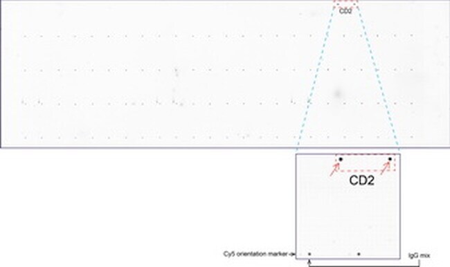 - OriGene overexpression protein microarray chip was immunostained with UltraMAB anti-CD2 mouse monoclonal antibody (Clone UMAB6). The positive reactive proteins are highlighted with two red arrows in the enlarged subarray. All the positive controls spotted in this subarray are also labeled for clarification. These data show that UltraMAB anti-CD2 (Clone UMAB6) very specifically recognizes Cd2 antigen on OriGene protein microarray chip.