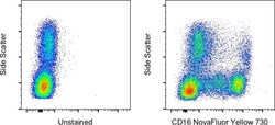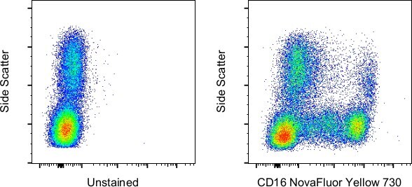- Staining of normal human PBMCs with side scatter and unstained (left) or CD16 Monoclonal Antibody, NovaFluor Yellow 730 (right). Data was acquired in the YG8 channel on a 5-laser Cytek Aurora and singlet cells were used for analysis.