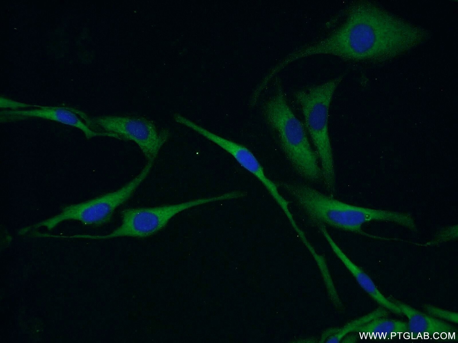 - Immunofluorescent analysis of SKOV-3 cells using 18087-1-AP (MMP26 antibody) at dilution of 1:50 and Alexa Fluor 488-conjugated AffiniPure Goat Anti-Rabbit IGG (H+L).