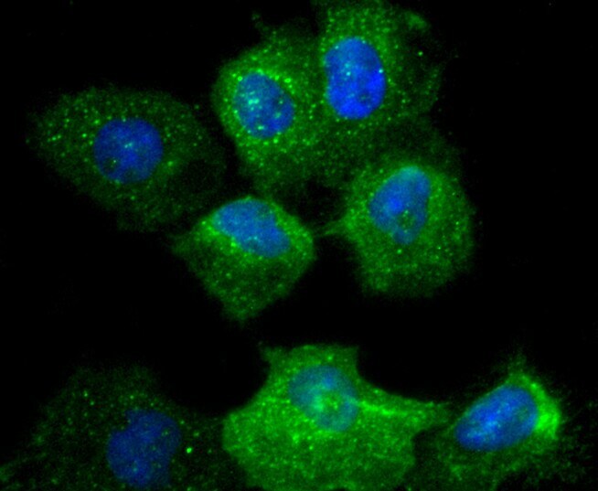 - Immunocytochemical analysis of CD49b (Integrin alpha 2) in A431 cells using a CD49b (Integrin alpha 2) Monoclonal antibody (Product # MA5-32306) as seen in green. The nuclear counter stain is DAPI (blue). Cells were fixed in paraformaldehyde, permeabilised with 0.25% Triton X100/PBS.