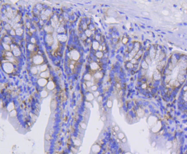 - Immunohistochemical analysis of CD49b (Integrin alpha 2) of paraffin-embedded Mouse colon tissue using a CD49b-Integrin-alpha-2 Monoclonal antibody (Product #MA5-32306). Counter stained with hematoxylin.