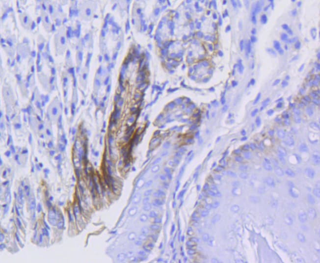 - Immunohistochemical analysis of CD49b (Integrin alpha 2) of paraffin-embedded Mouse stomach tissue using a CD49b-Integrin-alpha-2 Monoclonal antibody (Product #MA5-32306). Counter stained with hematoxylin.