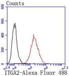 - Flow Cytometric analysis of CD49b (Integrin alpha 2) in A431 cells using a CD49b (Integrin alpha 2) Monoclonal Antibody (Product # MA5-32306) at a dilution of 1:50, as seen in red compared with an unlabelled control (cells without incubation with primary antibody; black). Alexa Fluor 488-conjugated goat anti rabbit IgG was used as the secondary antibody.