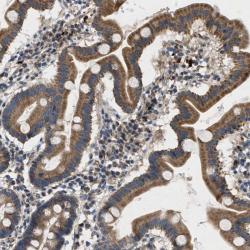 - Immunohistochemical staining of human duodenum shows moderate cytoplasmic positivity in glandular cells.