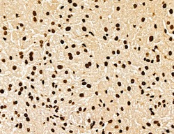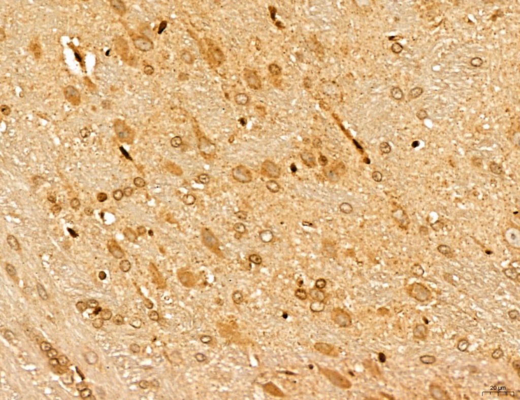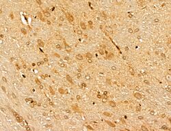 - Immunohistochemistry analysis of MARS in rat brain tissue. Samples were treated with formaldehyde and treated with citrate buffer for antigen retrieval, blocked, and incubated (1.5 hours at 22°C) with polyclonal antibody (Product # PA5-115547) at a dilution of 1:100. Secondary staining was applied with HRP conjugated anti-Rabbit.