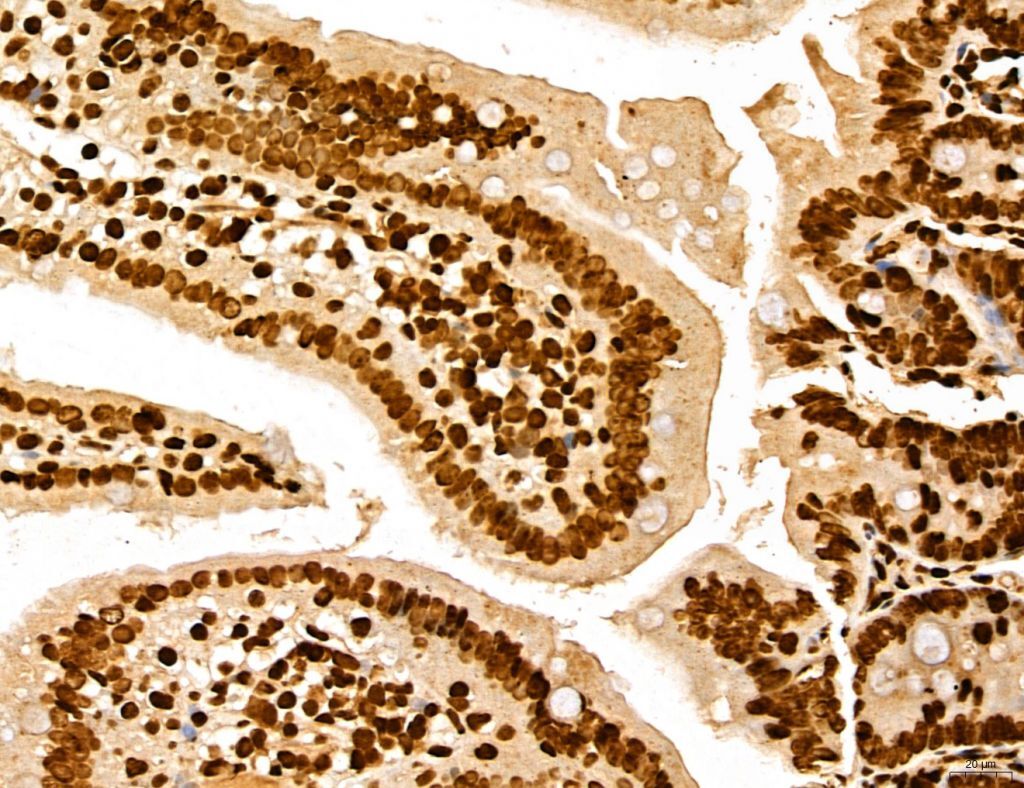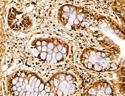 - Immunohistochemistry analysis of MARS in mouse colon tissue. Samples were treated with formaldehyde and treated with citrate buffer for antigen retrieval, blocked, and incubated (1.5 hours at 22°C) with polyclonal antibody (Product # PA5-115547) at a dilution of 1:100. Secondary staining was applied with HRP conjugated anti-Rabbit.