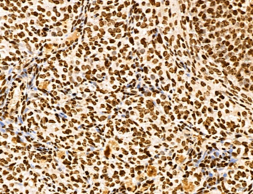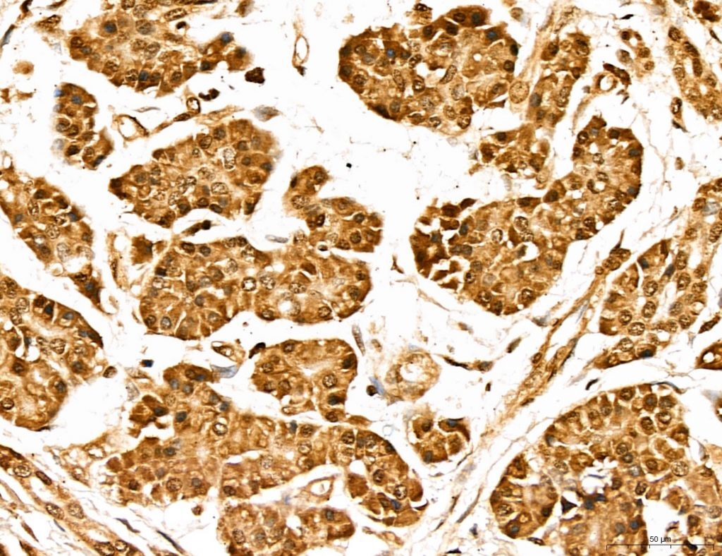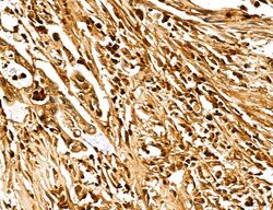 - Immunohistochemistry analysis of MARS in human mammary cancer. Samples were treated with formaldehyde and treated with citrate buffer for antigen retrieval, blocked, and incubated (1.5 hours at 22°C) with polyclonal antibody (Product # PA5-115547) at a dilution of 1:100. Secondary staining was applied with HRP conjugated anti-Rabbit.