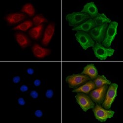 - Immunocytochemistry analysis of MARS in HeLa cells. Samples were treated with PFA, permeabilized in 0.1% Triton X-100, blocked in 10% serum (45 min at 25°C), and incubated with polyclonal antibody (Product # PA5-115547). Secondary staining was applied with mouse anti-beta tubulin (1 hr at 37°, AlexaFluor 594 conjugated goat anti-rabbit IgG (Red), AlexaFluor 488 conjugated goat anti-mouse IgG (Green) and DAPI.