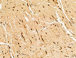 - Immunohistochemistry analysis of MARS in mouse heart tissue. Samples were treated with formaldehyde and treated with citrate buffer for antigen retrieval, blocked, and incubated (1.5 hours at 22°C) with polyclonal antibody (Product # PA5-115547) at a dilution of 1:100. Secondary staining was applied with HRP conjugated anti-Rabbit.