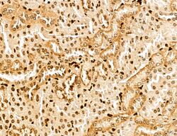 - Immunohistochemistry analysis of MARS in rat kidney tissue. Samples were treated with formaldehyde and treated with citrate buffer for antigen retrieval, blocked, and incubated (1.5 hours at 22°C) with polyclonal antibody (Product # PA5-115547) at a dilution of 1:100. Secondary staining was applied with HRP conjugated anti-Rabbit.