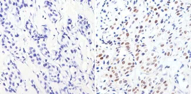 - Immunohistochemistry analysis of GATA3 showing staining in the nucleus of paraffin-embedded human breast carcinoma (right) compared to a negative control without primary antibody (left). To expose target proteins, antigen retrieval was performed using 10mM sodium citrate (pH 6.0), microwaved for 8-15 min. Following antigen retrieval, tissues were blocked in 3% H2O2-methanol for 15 min at room temperature, washed with ddH2O and PBS, and then probed with a GATA3 monoclonal antibody (Product # MA1-028) diluted in 3% BSA-PBS at a dilution of 1:1000 overnight at 4°C in a humidified chamber. Tissues were washed extensively in PBST and detection was performed using an HRP-conjugated secondary antibody followed by colorimetric detection using a DAB kit. Tissues were counterstained with hematoxylin and dehydrated with ethanol and xylene to prep for mounting.