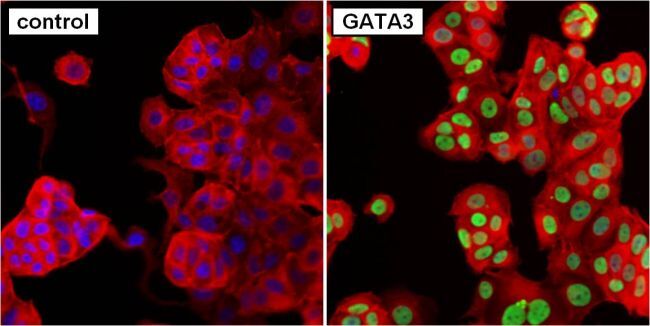 - Immunofluorescent analysis of GATA3 (green) in MCF7 cells. Formalin fixed cells were permeabilized with 0.1% Triton X-100 in TBS for 10 minutes at room temperature. Cells were blocked with 1% Blocker BSA (Product # 37525) for 15 minutes at room temperature. Cells were probed without (left panel) or with (right panel) a GATA3 monoclonal antibody (Product # MA1-028) at a dilution of 1:50 for at least 1 hour at room temperature, washed with PBS, and incubated with a DyLight 488-conjugated goat anti-mouse IgG secondary antibody (Product # 35503) at a dilution of 1:400 for 30 minutes at room temperature. F-Actin (red) was stained with DyLight-554 Phalloidin (Product # 21834) and nuclei (blue) were stained with Hoechst 33342 dye (Product # 62249). Images were taken on a Thermo Scientific ToxInsight Instrument at 20X magnification.