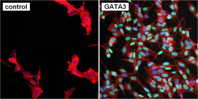- Immunofluorescent analysis of GATA3 (green) in SH-SY5Y cells. Formalin fixed cells were permeabilized with 0.1% Triton X-100 in TBS for 10 minutes at room temperature. Cells were blocked with 1% Blocker BSA (Product # 37525) for 15 minutes at room temperature. Cells were probed without (left panel) or with (right panel) a GATA3 monoclonal antibody (Product # MA1-028) at a dilution of 1:50 for at least 1 hour at room temperature, washed with PBS, and incubated with a DyLight 488-conjugated goat anti-mouse IgG secondary antibody (Product # 35503) at a dilution of 1:400 for 30 minutes at room temperature. F-Actin (red) was stained with DyLight-554 Phalloidin (Product # 21834) and nuclei (blue) were stained with Hoechst 33342 dye (Product # 62249). Images were taken on a Thermo Scientific ToxInsight Instrument at 20X magnification.