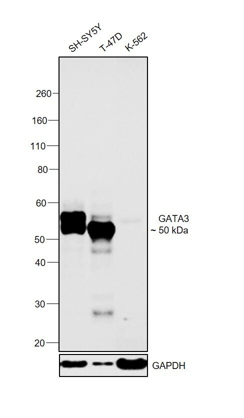 - Western blot was performed using Anti-GATA3 Monoclonal Antibody (1A12-1D9) (Product # MA1-028) and a 50 kDa band corresponding to GATA3 was observed across cell lines tested except K-562 which is reported to be negative. Modified whole cell extracts (1% SDS) (30 µg lysate) of SH-SY5Y (Lane 1), T-47D (Lane 2) and K-562 (Lane 3) were electrophoresed using NuPAGE™ 4-12% Bis-Tris Protein Gel (Product # NP0322BOX). Resolved proteins were then transferred onto a nitrocellulose membrane (Product # IB23001) by iBlot® 2 Dry Blotting System (Product # IB21001). The blot was probed with the primary antibody (1:1000 dilution) and detected by chemiluminescence with Goat anti-Mouse IgG (H+L) Superclonal™ Recombinant Secondary Antibody, HRP (Product # A28177, 1:4000 dilution) using the iBright FL 1000 (Product # A32752). Chemiluminescent detection was performed using SuperSignal™ West Dura Extended Duration Substrate (Product # 34076).