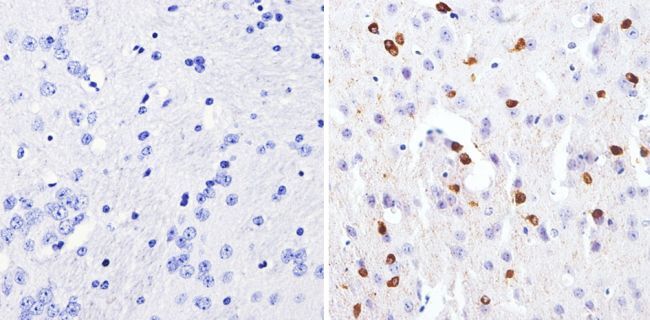 - Immunohistochemistry analysis of GATA3 showing staining in the nucleus of paraffin-embedded rat brain tissue (right) compared to a negative control without primary antibody (left). To expose target proteins, antigen retrieval was performed using 10mM sodium citrate (pH 6.0), microwaved for 8-15 min. Following antigen retrieval, tissues were blocked in 3% H2O2-methanol for 15 min at room temperature, washed with ddH2O and PBS, and then probed with a GATA3 monoclonal antibody (Product # MA1-028) diluted in 3% BSA-PBS at a dilution of 1:200 overnight at 4°C in a humidified chamber. Tissues were washed extensively in PBST and detection was performed using an HRP-conjugated secondary antibody followed by colorimetric detection using a DAB kit. Tissues were counterstained with hematoxylin and dehydrated with ethanol and xylene to prep for mounting.
