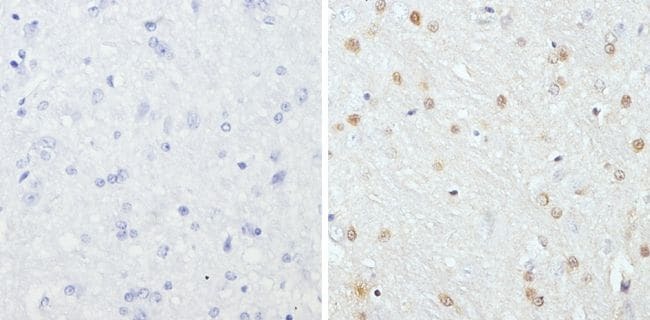 - Immunohistochemistry analysis of GATA3 showing staining in the nucleus of paraffin-embedded mouse brain tissue (right) compared to a negative control without primary antibody (left). To expose target proteins, antigen retrieval was performed using 10mM sodium citrate (pH 6.0), microwaved for 8-15 min. Following antigen retrieval, tissues were blocked in 3% H2O2-methanol for 15 min at room temperature, washed with ddH2O and PBS, and then probed with a GATA3 monoclonal antibody (Product # MA1-028) diluted in 3% BSA-PBS at a dilution of 1:1000 overnight at 4°C in a humidified chamber. Tissues were washed extensively in PBST and detection was performed using an HRP-conjugated secondary antibody followed by colorimetric detection using a DAB kit. Tissues were counterstained with hematoxylin and dehydrated with ethanol and xylene to prep for mounting.