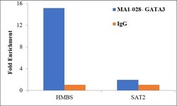 - Chromatin Immunoprecipitation (ChIP) assay of endogenous GATA3 protein using Anti-GATA3 Antibody: ChIP was performed using Anti-GATA3 Monoclonal Antibody (1A12-1D9) (Product # MA1-028) 5 µg, on sheared chromatin from HCT116 cells using the MAGnify ChIP System kit (Product # 49-2024). Normal Mouse IgG was used as a negative IP control. The purified DNA was analyzed by qPCR using primers binding to promoter of HMBS and SAT2 satellite repeats. Data is presented as fold enrichment of the antibody signal versus the negative control IgG using the comparative CT method.