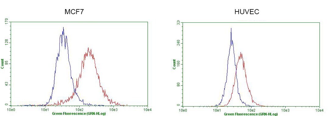 - Flow cytometric analysis of penetrated MCF-7 cells, using anti-GATA3 antibody (TA809142), (Red), compared to a nonspecific negative control antibody, (Blue). The right is HUVEC cells as negtive control. (1:100)