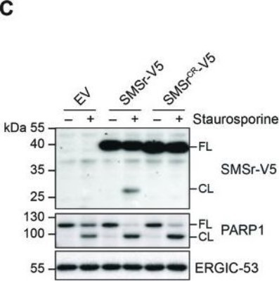 - Western Blot: LMAN1 Antibody (OTI1A8) [NBP2-03381] - Staurosporine-induced cleavage of SMSr is sensitive to caspase-6 inhibitors. HeLa cells stably transduced with EV, SMSr-V5, and SMSrCR-V5 were treated with 1 ug/ml staurosporine for 6 h, lysed and subjected to immunoblot analysis using anti-V5, anti-PARP1, and anti-ERGIC-53 antibodies; FL, full length; CL, cleaved. Image collected and cropped by CiteAb from the following publication (http://bioscirep.org/lookup/doi/10.1042/BSR20170867), licensed under a CC-BY licence.