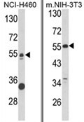 - (LEFT) Western blot analysis of LMAN1 Antibody (Center) (AP18098PU-N) in NCI-H460 cell line lysates (35ug/lane).LMAN1 (arrow) was detected using the purified Pab. (RIGHT) Western blot analysis of LMAN1 Antibody (Center) (AP18098PU-N) in NIH-3T3 cell line lysates (35ug/lane). LMAN1 (arrow) was detected using the purified Pab.