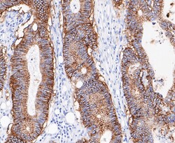 - Immunohistochemistry analysis of GPA33 in paraffin-embedded human colon cancer tissue. Samples were heat mediated antigen retrieval with Tris-EDTA buffer (pH 8.0-8.4, 20 minutes) and blocked in 5% BSA (30 min, room temperature), incubated with GPA33 monoclonal antibody (Product # MA5-34867) at a dilution of 1:200 (30 min, room temperature), and followed by HRP conjugate, DAB and hematoxylin (mounted with DPX).
