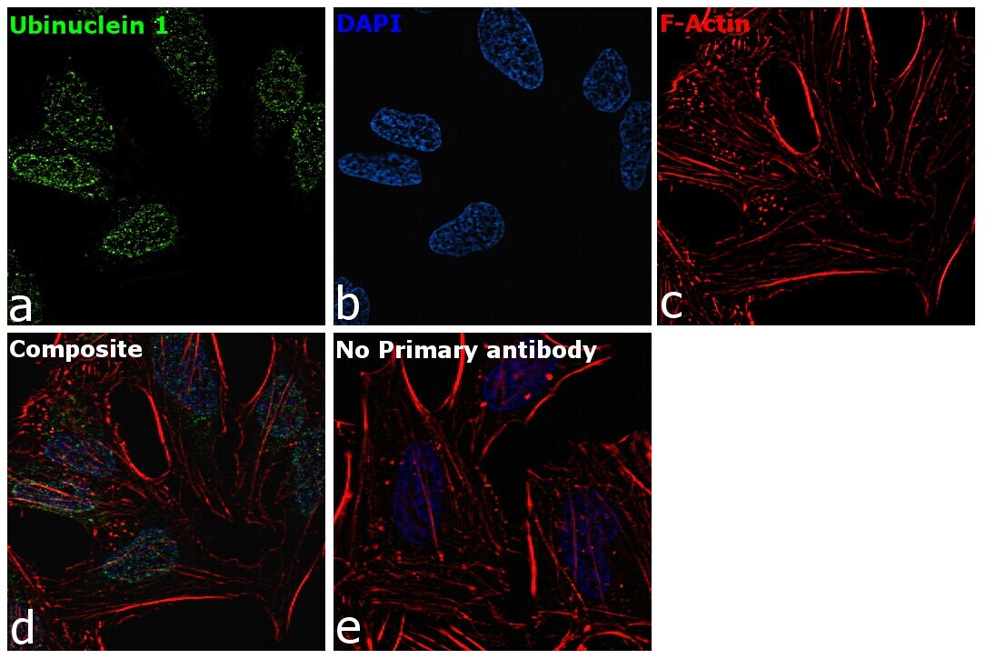 - For immunofluorescence analysis, HeLa cells were fixed and permeabilized with 0.5% Triton X-100 for detection of endogenous Ubinuclein 1 using Anti-Ubinuclein 1 Recombinant Rabbit Monoclonal Antibody (Product # 703605, 1:100 dilution) and labeled with Goat anti-Rabbit IgG (H+L) Highly Cross-Adsorbed Secondary Antibody, Alexa Fluor Plus 488 conjugate (Product # A32731, 1:2000). Panel a) shows representative cells that were stained for detection and localization of Ubinuclein1 protein (green), Panel b) is stained for nuclei (blue) using ProLong™ Diamond Antifade Mountant with DAPI (Product # P36962). Panel c) represents cytoskeletal F-actin staining using Rhodamine Phalloidin (Product # R415, 1:300). Panel d) is a composite image of Panels a, b and c clearly demonstrating nuclear localization of Ubinuclein 1. Panel e) represents control cells with no primary antibody to assess background. The images were captured at 60X magnification.