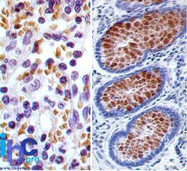 - Immunohistochemistry-Paraffin: RUNX3 Antibody (2B9G4) - Formalin-fixed, paraffin-embedded normal human spleen (left) and colon cancer tissue (right) stained with RUNX3 antibody (5 ug/ml), peroxidase-conjugate and DAB chromogen. This image was taken for the unconjugated form of this product. Other forms have not been tested.