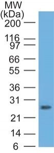 - Western Blot: RUNX3 Antibody (2B9G4) - Analysis of a partial recombinant Runx3 protein probed with Runx3 antibody at 0.5 ug/ml. goat anti-mouse Ig HRP secondary antibody and PicoTect ECL substrate solution were used for this test. This image was taken for the unconjugated form of this product. Other forms have not been tested.