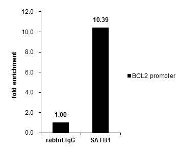 - Cross-linked ChIP was performed with Jurkat chromatin extract and 5 µg of either control rabbit IgG or SATB1 Polyclonal Antibody (Product # PA5-30163). The precipitated DNA was detected by PCR with primer set targeting to BCL2 promoter.