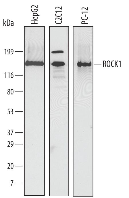 - Detection of Human, Mouse, and Rat ROCK1 by Western Blot. Western blot shows lysates of HepG2 human hepatocellular carcinoma cell line, C2C12 mouse myoblast cell line, and PC-12 rat adrenal pheochromocytoma cell line. PVDF membrane was probed with 2 µg/mL of Mouse Anti-Human ROCK1 Monoclonal Antibody (Catalog # MAB4590) followed by HRP-conjugated Anti-Mouse IgG Secondary Antibody (Catalog # HAF007). A specific band was detected for ROCK1 at approximately 160 kDa (as indicated). This experiment was conducted under reducing conditions and using Immunoblot Buffer Group 1.