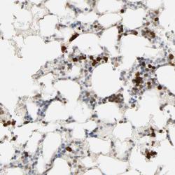- Immunohistochemical staining of human bone marrow shows strong cytoplasmic and nuclear positivity in bone marrow poietic cells.