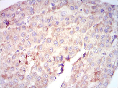 - IHC of paraffin-embedded liver cancer tissues using RAF1 mouse monoclonal antibody with DAB staining.