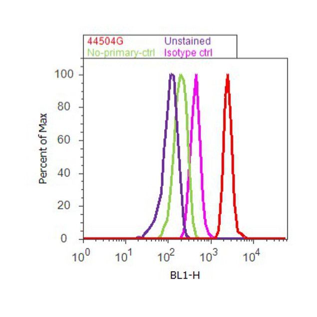 - Flow cytometry analysis of c-RAF [pS621] was done on A549 cells treated with EGF (200ng/ml, 10 minutes). Cells were fixed with 70% ethanol for 10 minutes, permeabilized with 0.25% Tritonª X-100 for 20 minutes, and blocked with 5% BSA for 30 minutes at room temperature. Cells were labeled with c-RAF [pS621] Rabbit Polyclonal Antibody (44504G, red histogram) or with rabbit isotype control (pink histogram) at 3-5 µg/million cells in 2.5% BSA. After incubation at room temperature for 2 hours, the cells were labeled with Alexa Fluor¨ 488 Goat Anti-Rabbit Secondary Antibody (A11008) at a dilution of 1:400 for 30 minutes at room temperature. The representative 10,000 cells were acquired and analyzed for each sample using an Attune¨ Acoustic Focusing Cytometer. The purple histogram represents unstained control cells and the green histogram represents no-primary-antibody control.