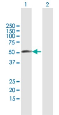 - Western Blot: RBM23 Antibody [H00055147-B01P] - Analysis of RBM23 expression in transfected 293T cell line by RBM23 polyclonal antibody. Lane 1: RBM23 transfected lysate(46.64 KDa). Lane 2: Non-transfected lysate.