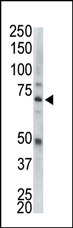 - Western blot analysis of anti-STK33 Pab (Cat#AP14426PU-N) in NCI-H460 cell lysate. STK33 (arrow) was detected using purified Pab. Secondary HRP-anti-rabbit was used for signal visualization with chemiluminescence.