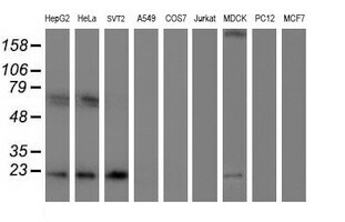 - Western blot analysis of extracts (35 µg) from 9 different cell lines by usin g anti-UBE2E3 monoclonal antibody (HepG2: human; HeLa: human; SVT2: mouse; A549: human; COS7: monkey; Jurkat: human; MDCK: canine; PC12: rat; MCF7: human).