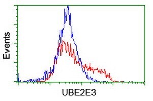 - HEK293T cells transfected with either RC210328 overexpress plasmid (Red) or empty vector control plasmid (Blue) were immunostained by anti-UBE2E3 antibody (TA504682), and then analyzed by flow cytometry.