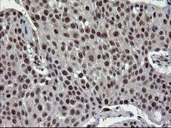 - Immunohistochemical staining of paraffin-embedded Adenocarcinoma of Human endometrium tissue using anti-UBE2E3 mouse monoclonal antibody. (Heat-induced epitope retrieval by 10mM citric buffer, pH6.0, 100°C for 10min, TA504682)