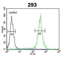 - Flow Cytometry: 293 cells stained with ARG54991 anti-UNC13B antibody (right histogram) or without primary antibody control (left histogram), followed by incubation with FITC labelled secondary antibody.