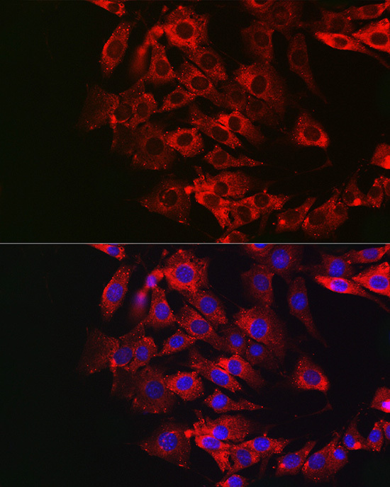 - Immunofluorescence analysis of NIH/3T3 cells using DFNA5/GSDME antibody (STJ29568) at dilution of 1:50. Blue: DAPI for nuclear staining.