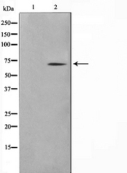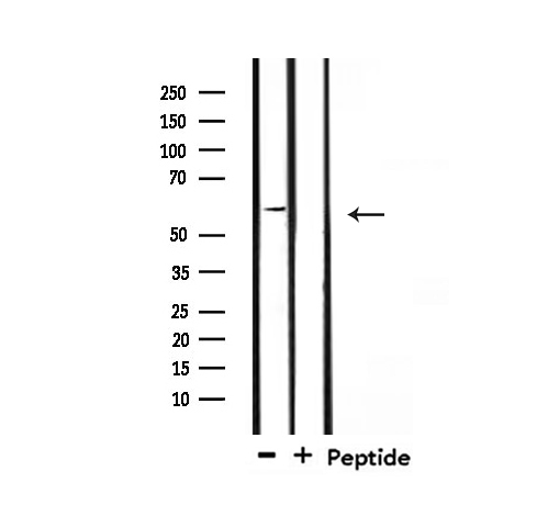- Western blot analysis on NIH-3T3 cell lysates using TGFR2 antibody. The lane on the left is treated with the antigen-specific peptide.