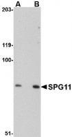 - Western blot analysis of SPG11 in mouse heart tissue lysate with SPG11 antibody at (A) 0.5 and (B) 1 ug/mL.