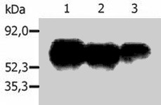 - Immunoprecipitation of human PAG1 from the lysate of Raji human Burkitt lymphoma cell line. Western blot was immunostained with human PAG1 monoclonal antibody, clone PAG - C1 (Cat # MAB0934). PAG1 is a 46 KDa adaptor protein, which however migrates on SDS PAGE gels anomalously as an 80 KDa molecule. Lane 1, 2 : Immunoprecipitation with PAG1 monoclonal antibody, clone PAG - C1 (Cat # MAB0934). Lane 3 : Immunoprecipitation with PAG1 polyclonal antibody.