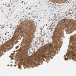 - Immunohistochemical staining of human urinary bladder shows strong cytoplasmic positivity in urothelial cells.